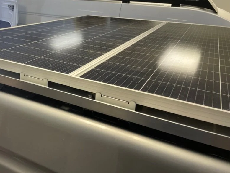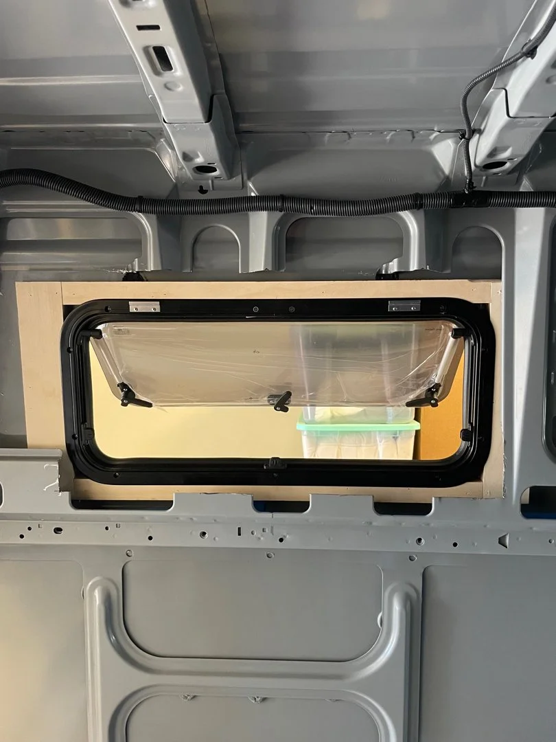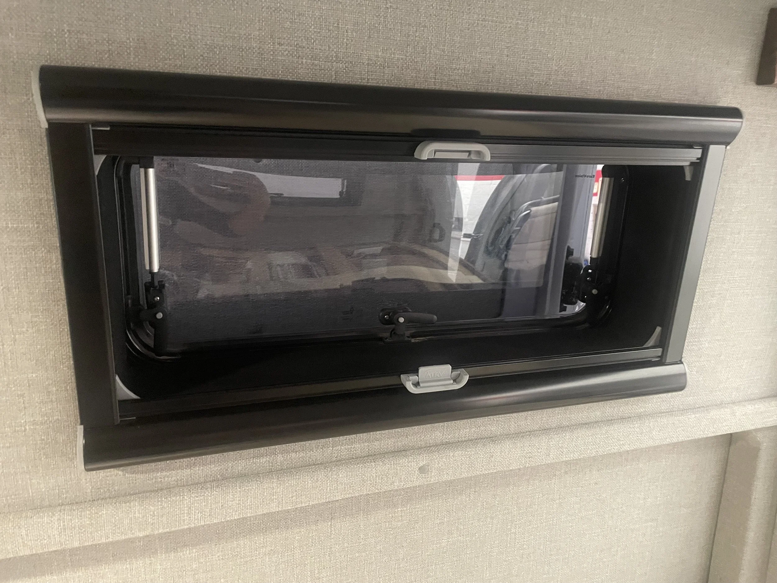 Arctic Tern Windows (300mm x 700mm) – Dual-pane acrylic windows with built-in bug screens and blackout shades, installed high in the upper framing for privacy and airflow.