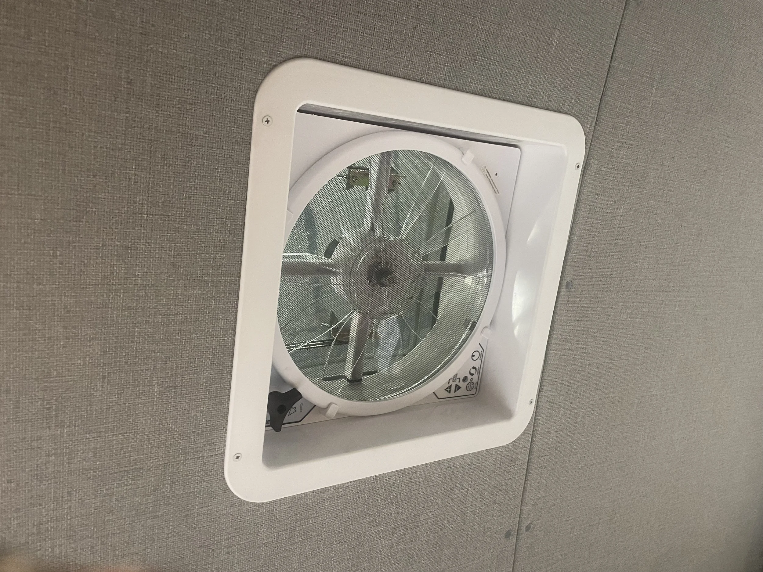 Maxxair Deluxe Vent Fan (7500 series) – Powered roof ventilation with remote and rain sensor.