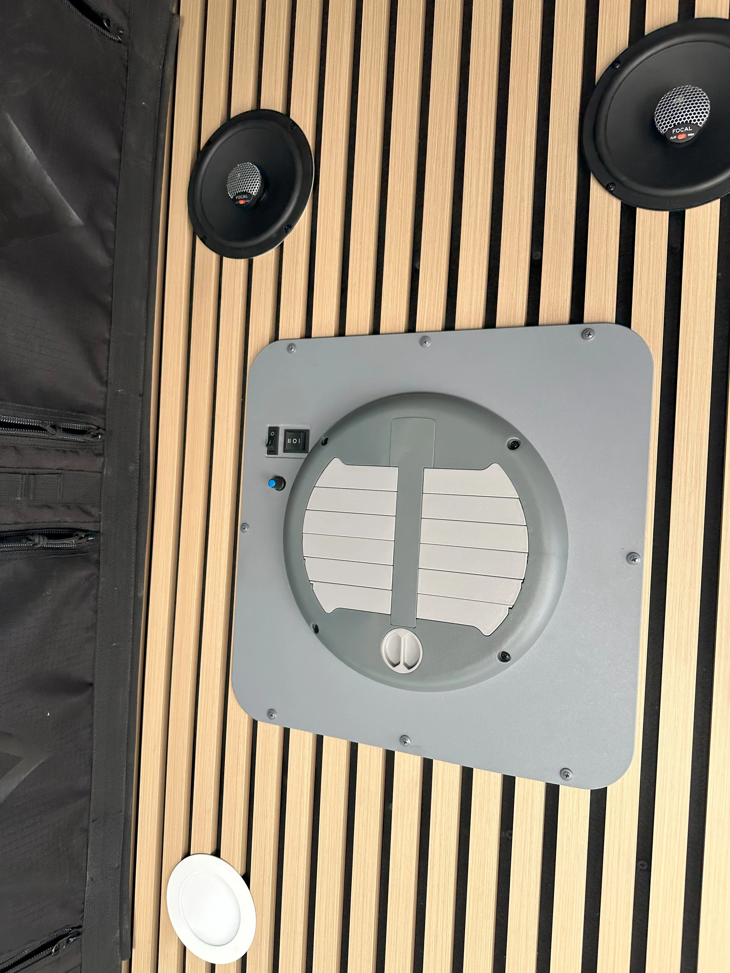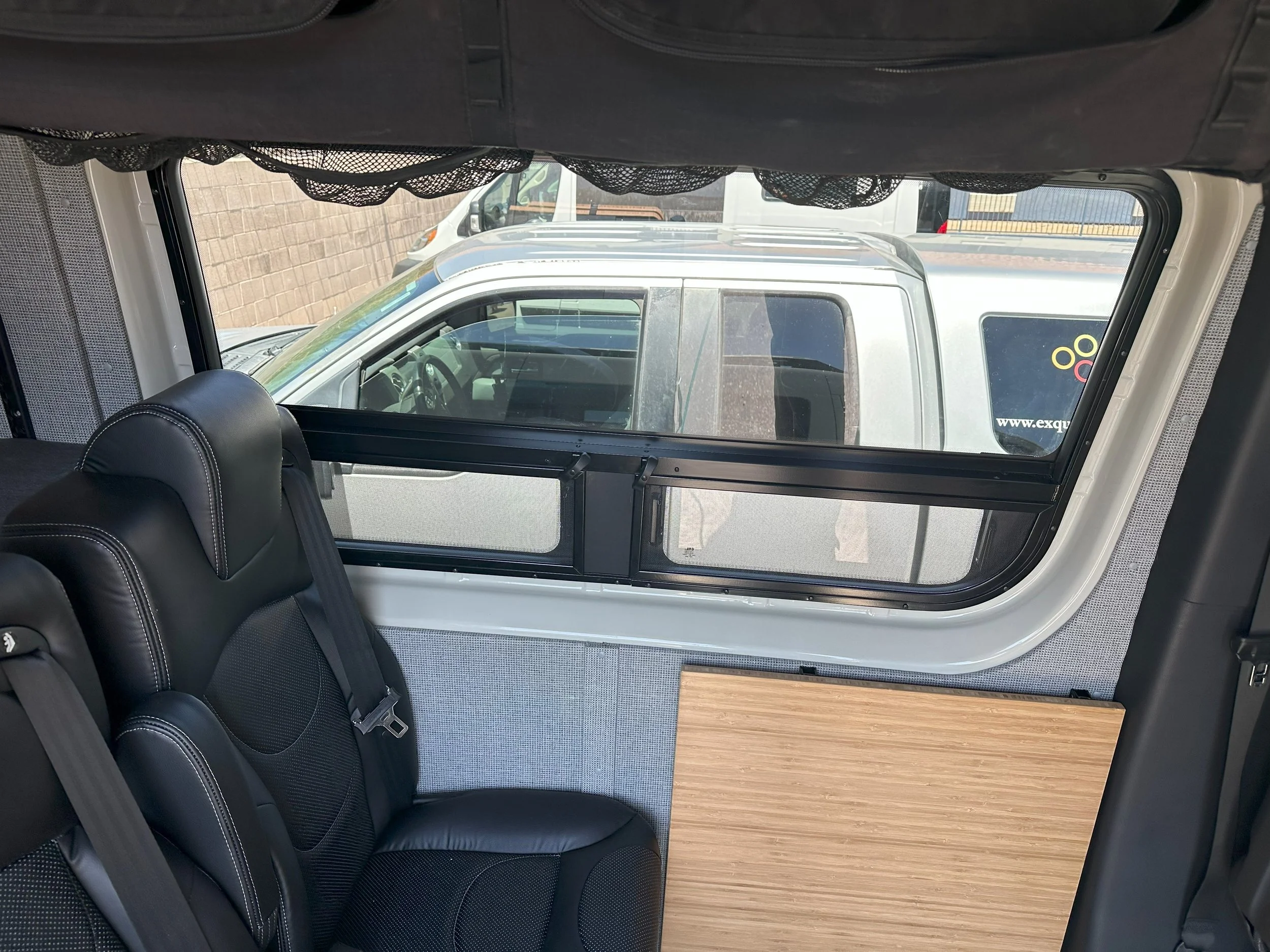 Along the way, we also incorporated several custom-approved enhancements, including a quick-disconnect water heater system, added AC outlets for convenience near the driver’s seat and garage, a Sprinter step extension for easier access, a premium audio setup with amp, sub, and ceiling speakers, and GoCode window trim for a clean, finished look.