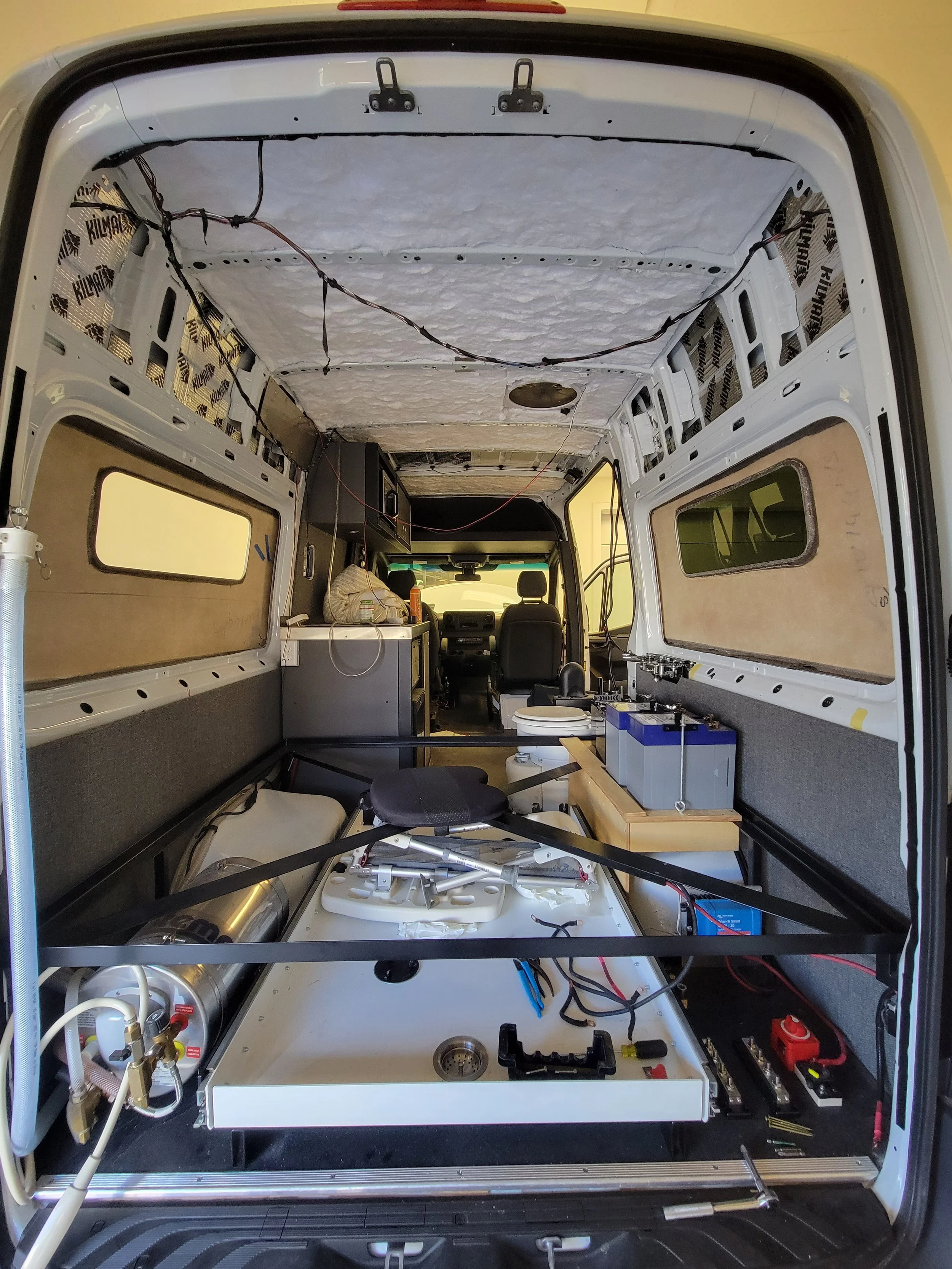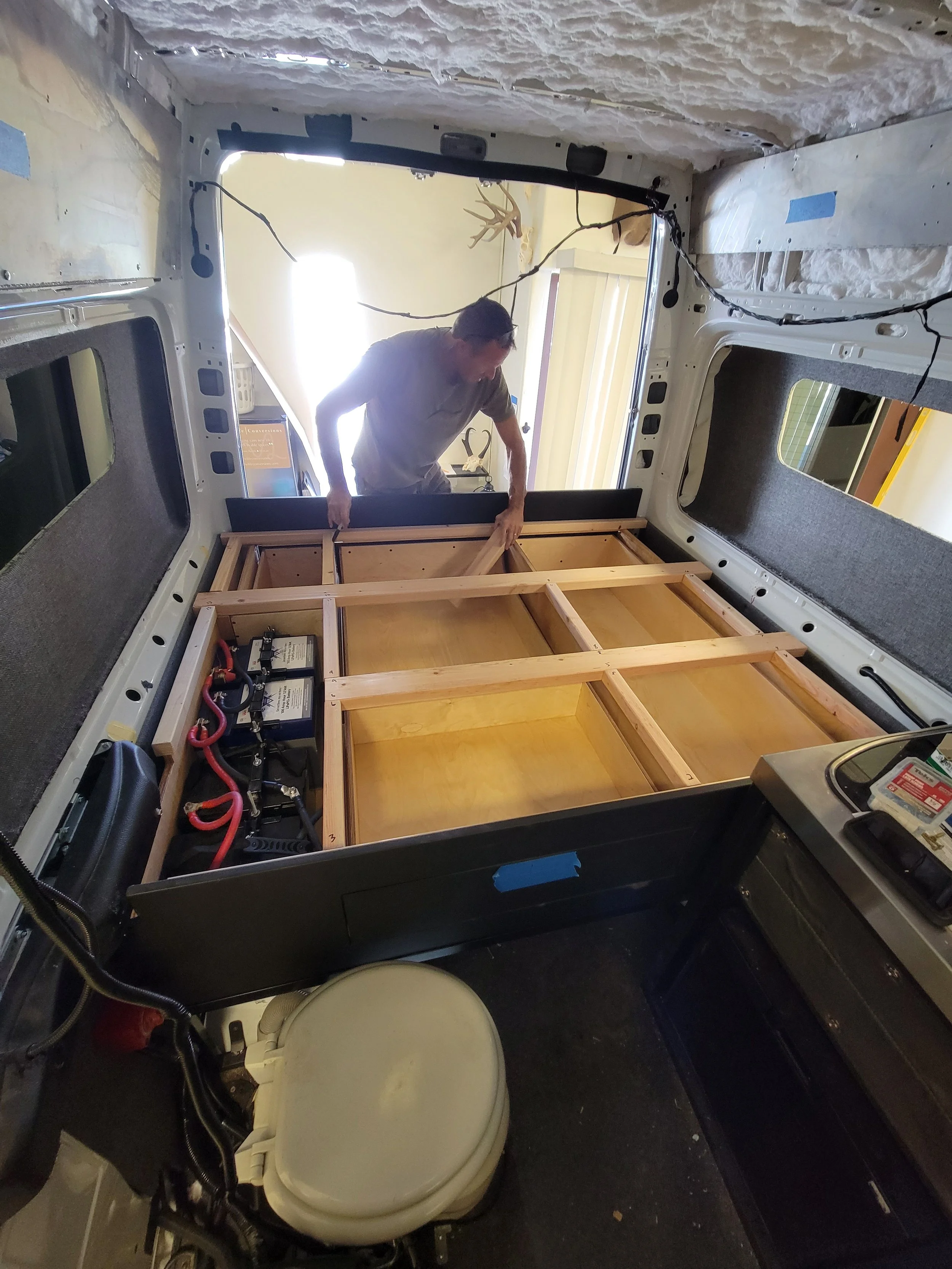 This client came to us with an already converted camper van that had a few issues and shortcomings. Some of the accessories were draining the starter batteries. Mercedes couldn’t figure it out and other RV repair shops didn’t want to touch it. That’s where we come in. We diagnosed the parasitic power draw, which was coming from his handicap accessible ramp not having a master on/off switch. We added an air conditioner, upgraded the battery bank, raised the bed height, added flarespace flares, and built under bed storage cabinets. They were thrilled with all the work that was done and had only wished they had known about us when they originally had their van built.